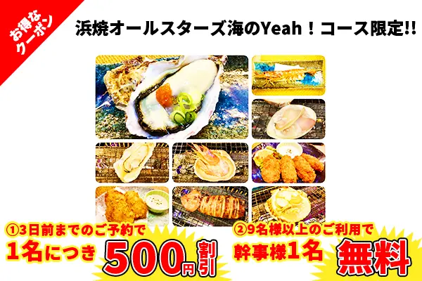 予約必須/19時までにご来店の方/コース予約の方に限る/2名様より受付/浜焼オールスターズ・浜焼オールスターズ海のYeah!!のみ利用可能/金・土・祝前日は利用できません